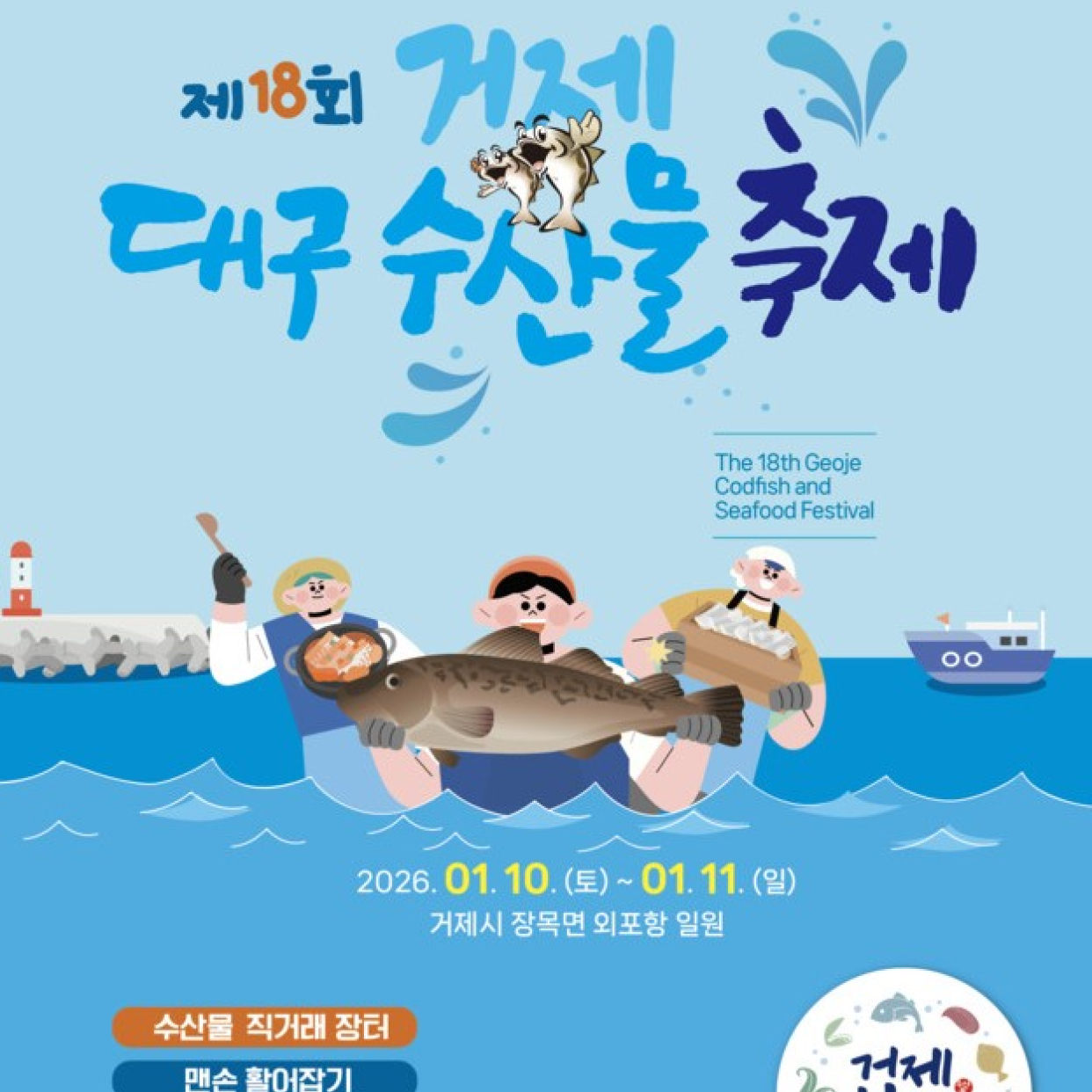 거제 대구 수산물 축제는 직거래 장터에서 신선한 수산물을 합리적인 가격에 만나고 맨손 활어잡기 체험도 진행된다. 가수 류지광, 영기의 축하공연까지 더해질 예정이다. ·행사일시 : 2026.1 . 10. (토) ~ 2026.1. 11. (일)·주소 : 거제
